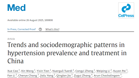 近日,国内一研究团队在国际知名医学期刊《Med》上发表了一篇题为《Trends and sociodemographic patterns in hypertension prevalence and treatment in China》的研究报告。该研究基于全国范围内具有代表性的大规模调查,系统比较了2012–2015年与2021–2022年两个时间段的数据,全面分析了中国成人高血压的最新流行趋势与管理现状,为制定针对性干预策略提供了重要的科学依据。