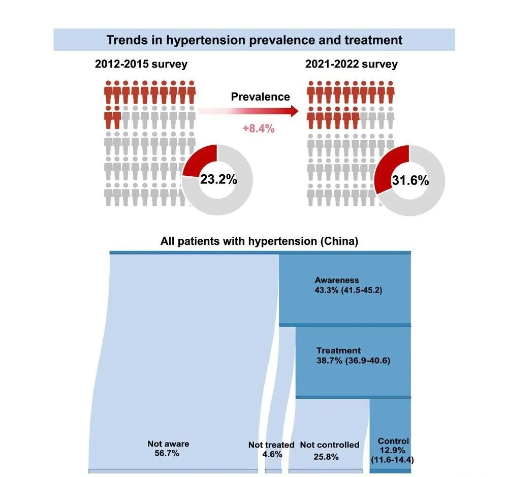 值得注意的是,农村地区的高血压患病率增长尤为显著,甚至已超过城市地区。这一变化与中国快速的城镇化进程密切相关。农村居民生活方式的转变、饮食中钠盐摄入的增加以及体力活动的减少,共同推动了高血压患病率在农村地区的攀升。
