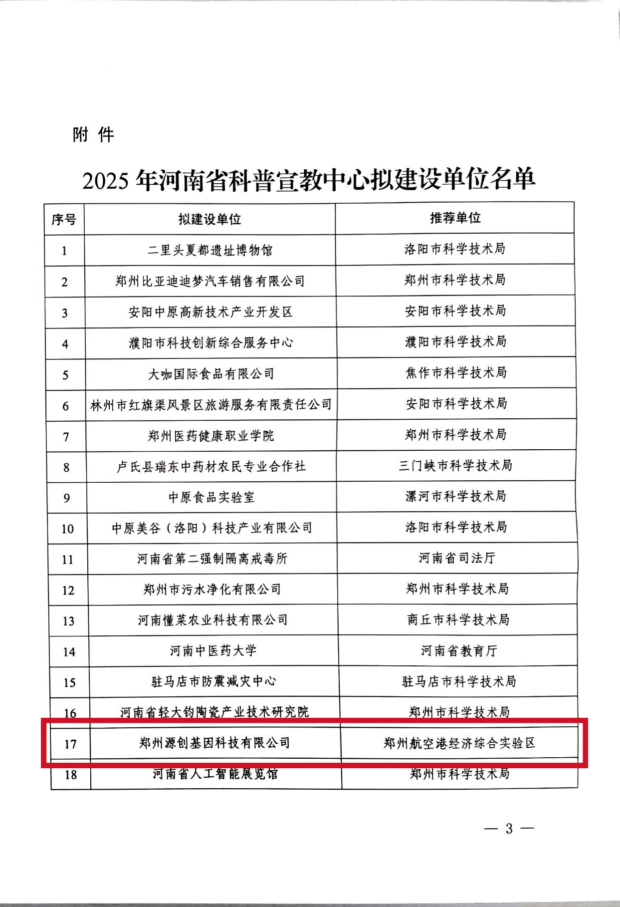 近日,河南省科学技术厅正式公布2025年河南省科普宣教中心建设单位名单,郑州源创基因科技有限公司凭借在生物细胞领域科普工作中的突出表现与综合实力,从众多申报单位中脱颖而出,成功入选!