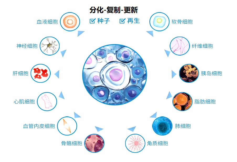 干细胞是一类具有自我更新和多向分化潜能的细胞。当组织受损或发生疾病时,干细胞能够响应体内信号,迁移至损伤部位,在局部微环境的诱导下分化为所需的功能细胞,替代衰老或受损细胞,从而实现组织修复与再生。