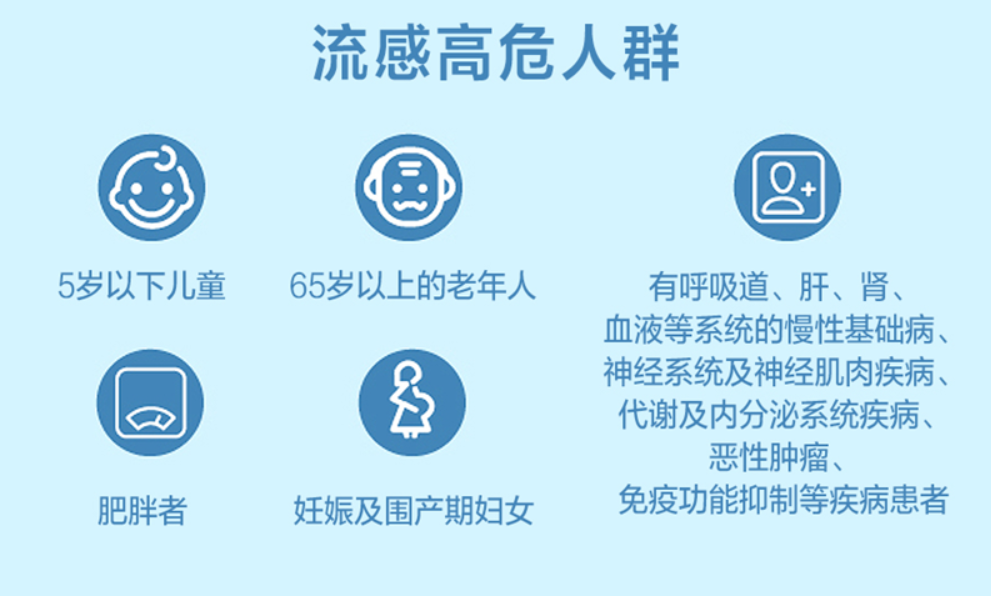 高风险人群应及时接种流感疫苗,包括:5岁以下儿童;65岁及以上老年人;孕妇;肥胖人群;患有慢性疾病者,如心血管疾病、慢性呼吸系统疾病、糖尿病及恶性肿瘤患者。