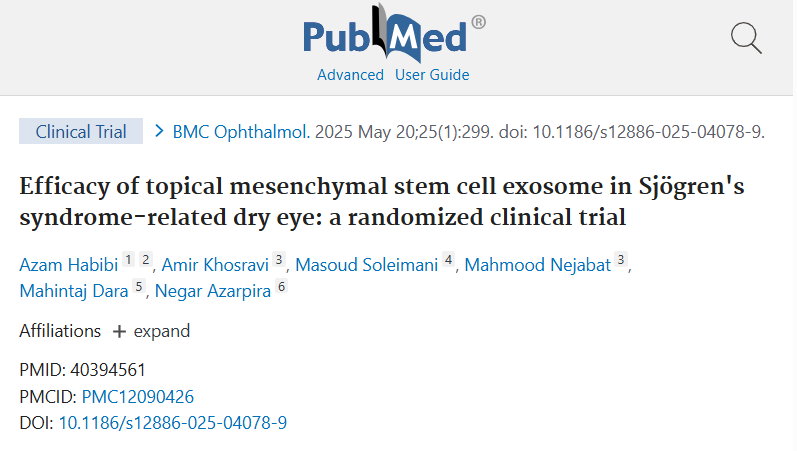 2025年5月28日发表在《BMC Ophthalmology》期刊的研究《HWJMSC外泌体滴眼液显著改善干燥综合征相关干眼症状和泪膜稳定性》,临床结果显示,使用外泌体滴眼液的治疗组在以下方面均有显著改善:眼表疾病指数(OSDI) 评分下降,泪液分泌量(Schirmer试验)增加,角膜荧光素染色评分降低。