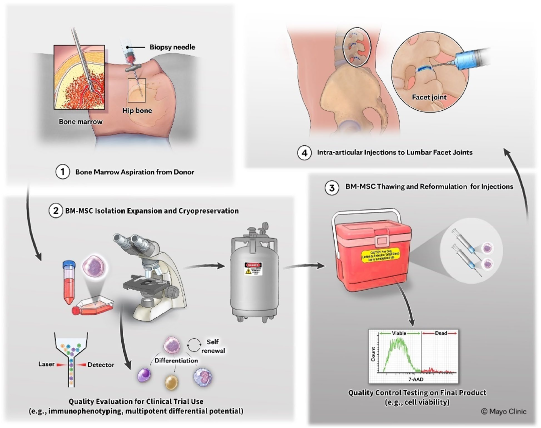 近期,美国佛罗里达州杰克逊维尔市的梅奥诊所完成了一项关于“关节内注射异体骨髓间充质干细胞(BM-MSCs)治疗疼痛性腰椎小关节病”的I期临床试验,相关结果已在国际期刊《Stem Cell Research & Therapy》上发表。该研究初步证实,关节内注射BM-MSCs干预LFA具有良好的安全性与潜在疗效。