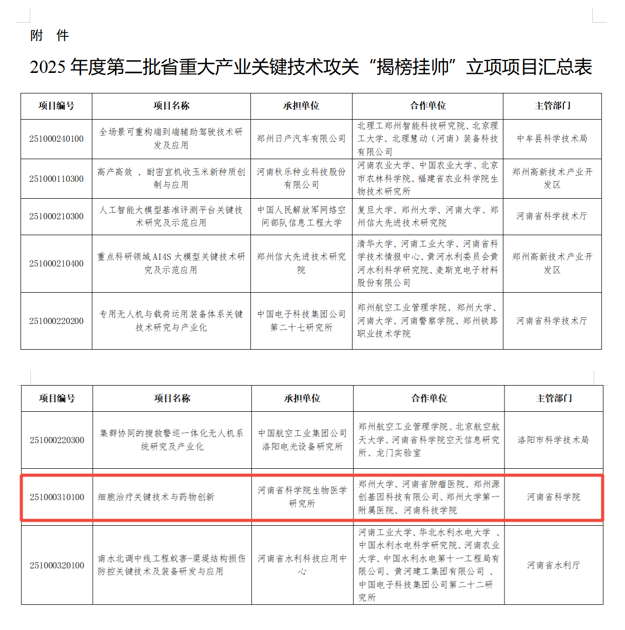 近日,河南省科学技术厅正式公布2025年度第二批省重大产业关键技术攻关“揭榜挂帅”立项项目名单,由河南省科学院生物医学研究所牵头,联合郑州大学、河南省肿瘤医院、郑州源创基因科技有限公司、郑州大学第一附属医院、河南科技学院共同发起的“细胞治疗关键技术与药物创新”项目成功入选!作为项目唯一企业参与方,源创基因将深度协同攻关,以优秀科研实力助力河南生物医药产业创新突破。