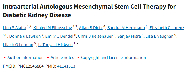 2025年发表于《肾脏国际报告》的临床研究“Intraarterial Autologous Mesenchymal Stem Cell Therapy for Diabetic Kidney Disease”通过肾动脉输注干细胞干预糖尿病肾病被证实是安全且可行的。并在其中一例病例中,观察到患者肾功能下降速度有所减缓。