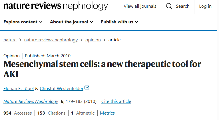 3、Tögel, F., & Westenfelder, C. (2012). Mesenchymal stem cells: a new therapeutic tool for AKI. Nature Reviews Nephrology, 8(7), 379-382.