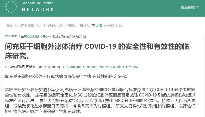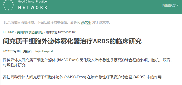 一项临床研究旨在评估雾化吸入同种异体人间充质干细胞外泌体改善ARDS的作用,证明其安全性与有效性。