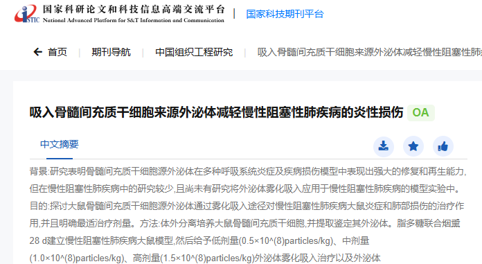 一篇发表于《中国组织工程研究》(2023年)的动物研究文章指出,雾化吸入骨髓间充质干细胞来源的外泌体可以减轻COPD大鼠模型的炎性损伤,并且发现低剂量效果最为显著。
