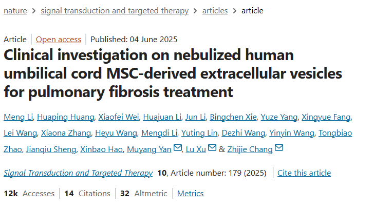 清华大学团队2025年发表在国际期刊《信号转导与靶向治疗》上的研究论文,报道了关于雾化吸入人脐带间充质干细胞来源的细胞外囊泡改善肺纤维化的I期临床试验结果。该研究指出24名患者中均显示出安全性和肺功能的改善,但需要更大样本的后续研究。
