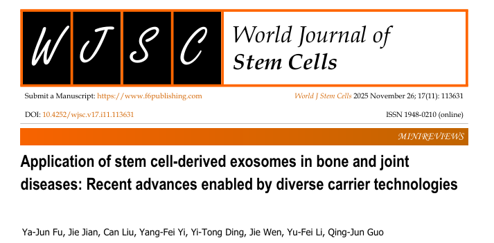 一篇题为《干细胞来源外泌体在骨关节疾病中的应用:多种载体技术推动的最新进展》的综述论文在国际权威期刊《World Journal of Stem Cells》(世界干细胞杂志,2025 年 11 月 26 日第 17 卷第 11 期)正式发表。该研究由湖南师范大学、河北医科大学、湖南省人民医院等多家机构的科研团队联合完成,系统梳理了干细胞外泌体结合载体技术在骨关节炎、类风湿关节炎、痛风性关节炎等疾病治疗中的最新成果,为这类高发且难治的疾病提供了全新的治疗思路。