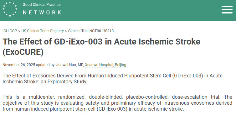 近日,首都医科大学宣武医院、国家神经疾病医学中心的团队在《Cell Communication and Signaling》期刊上发表综述,系统探讨了诱导多能干细胞来源的外泌体(如 GD-iExo-003)干预急性缺血性脑卒中的潜力,并已进入临床评估阶段。这标志着外泌体应用正从实验室走向临床实践。