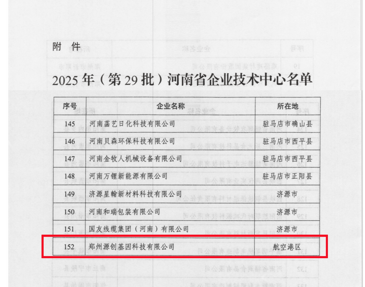 近日,河南省发展和改革委员会、省科学技术厅、省财政厅、国家税务总局河南省税务局、郑州海关五部门联合发布了2025年(第29批)河南省企业技术中心名单。郑州源创基因科技有限公司凭借扎实的研发实力与持续的技术创新,成功获评“河南省企业技术中心”。